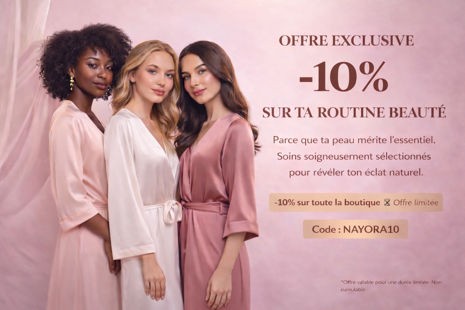 Chez NAYORA, nous sélectionnons des soins et accessoires beauté pensés pour révéler ton éclat naturel, sans compromis.